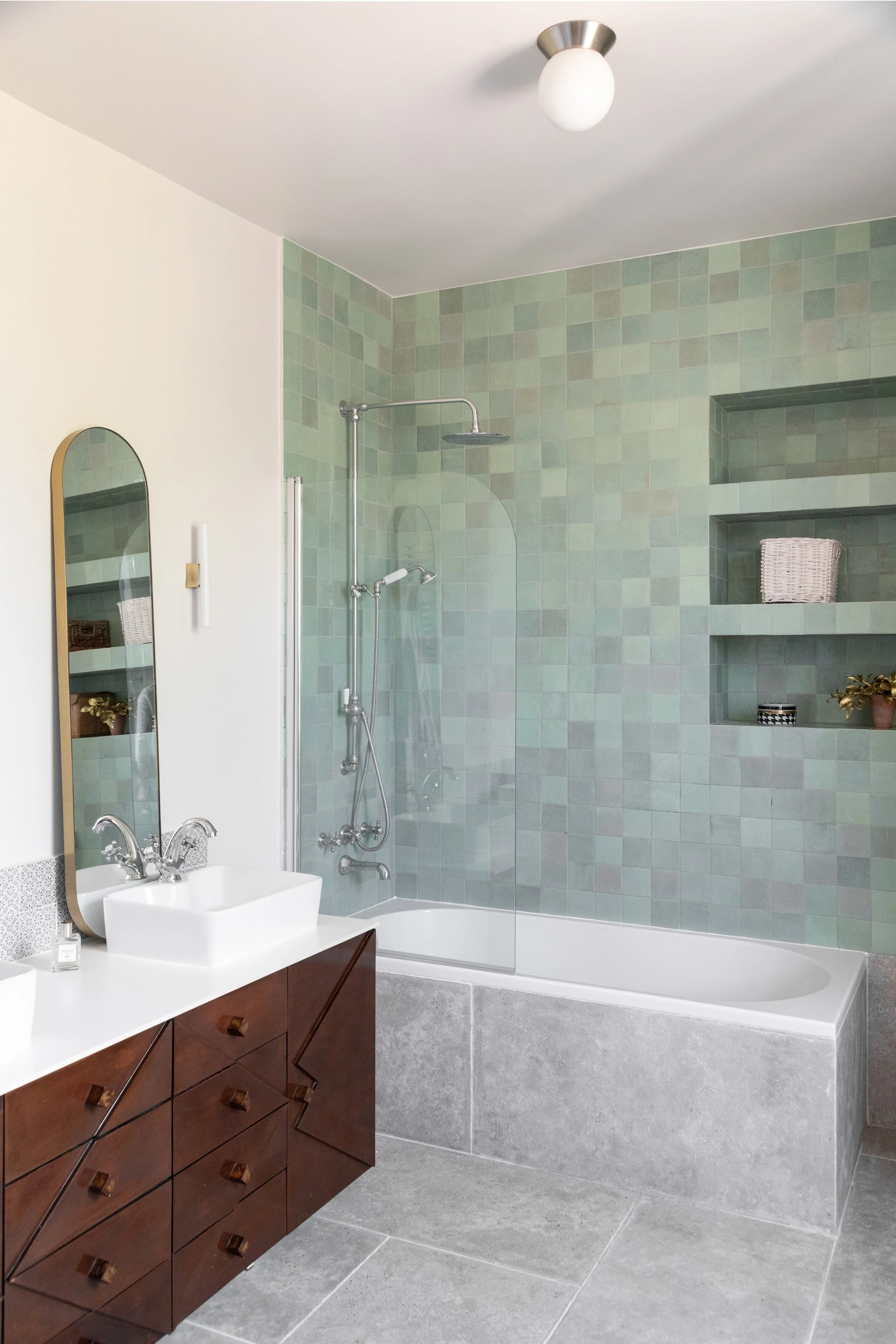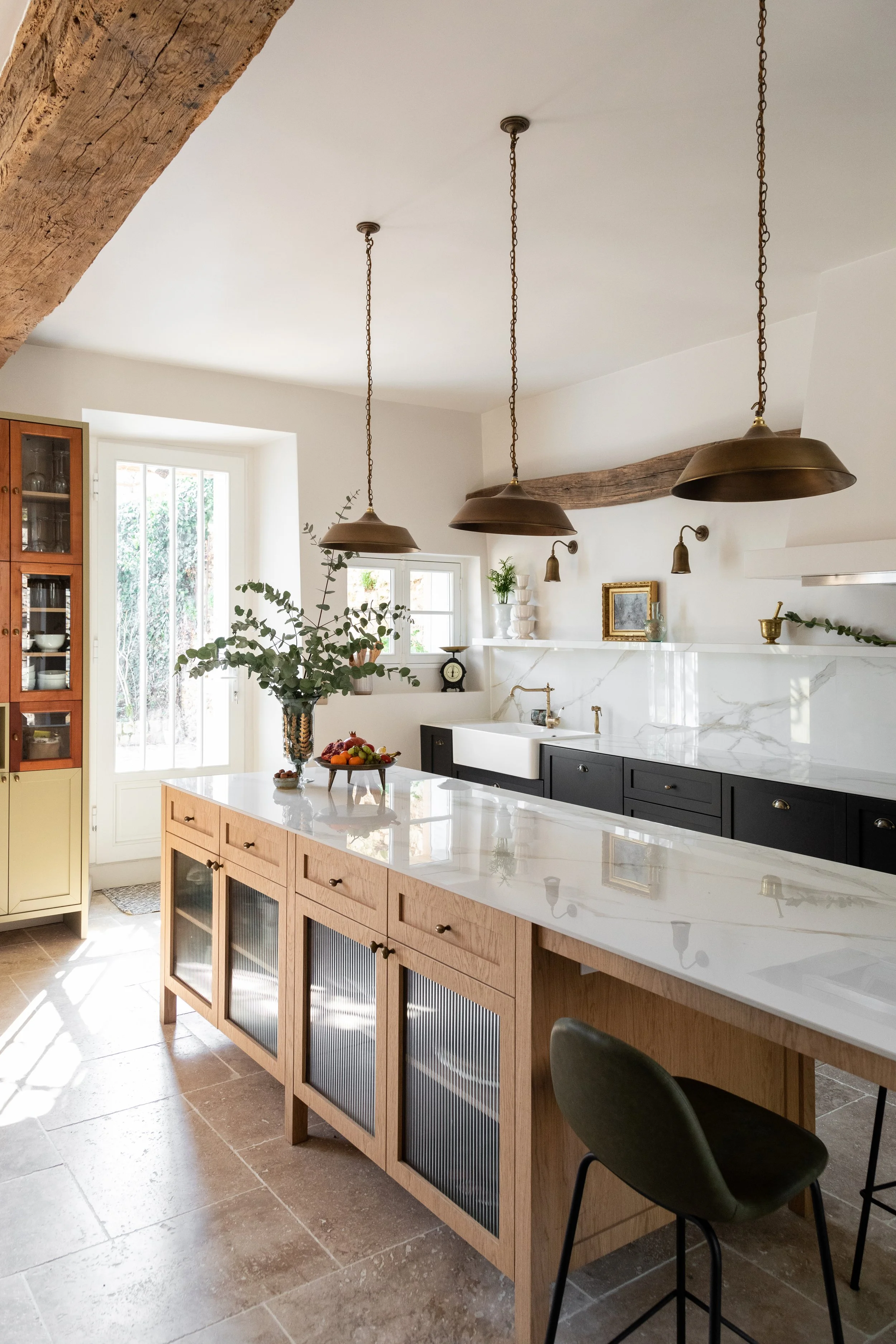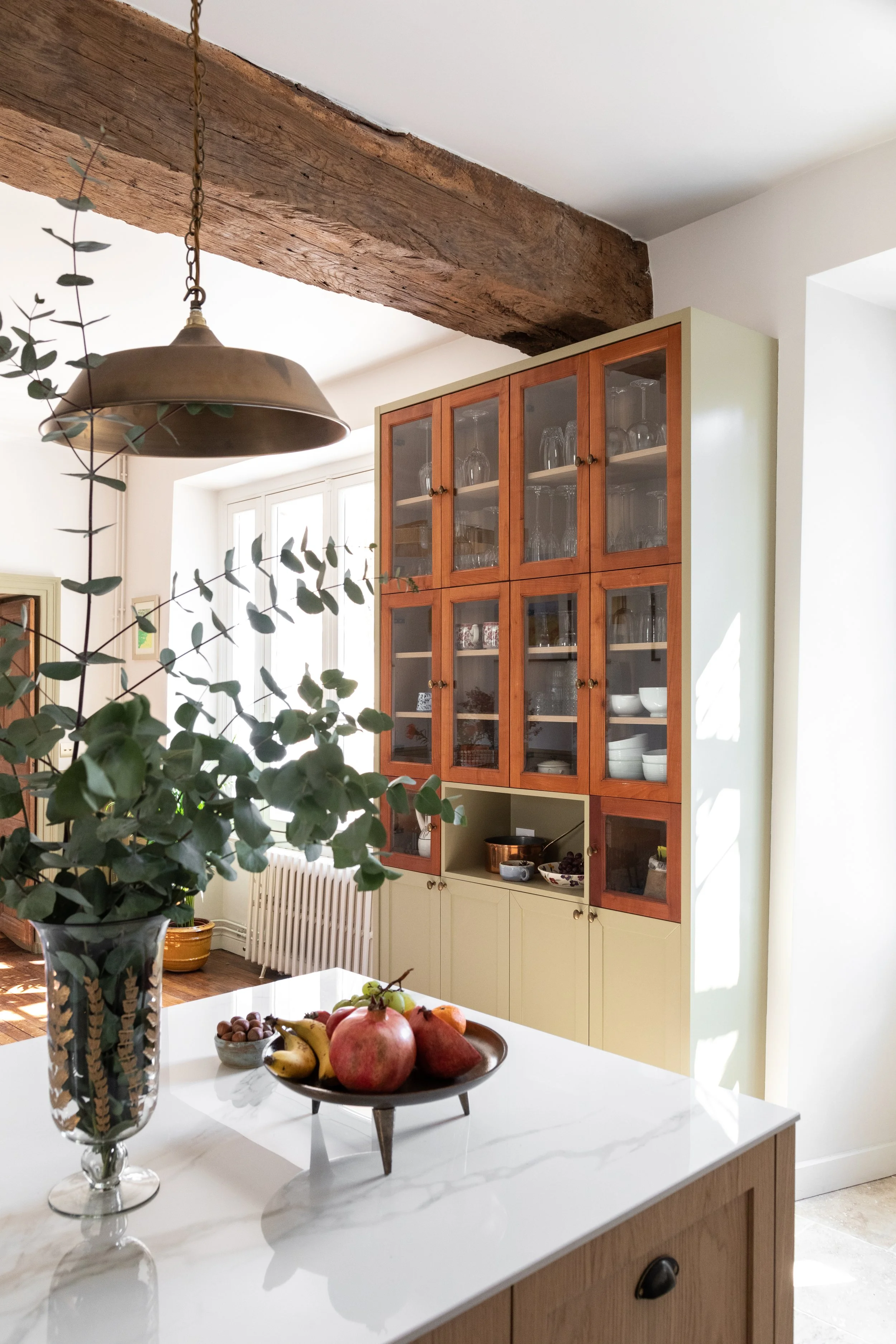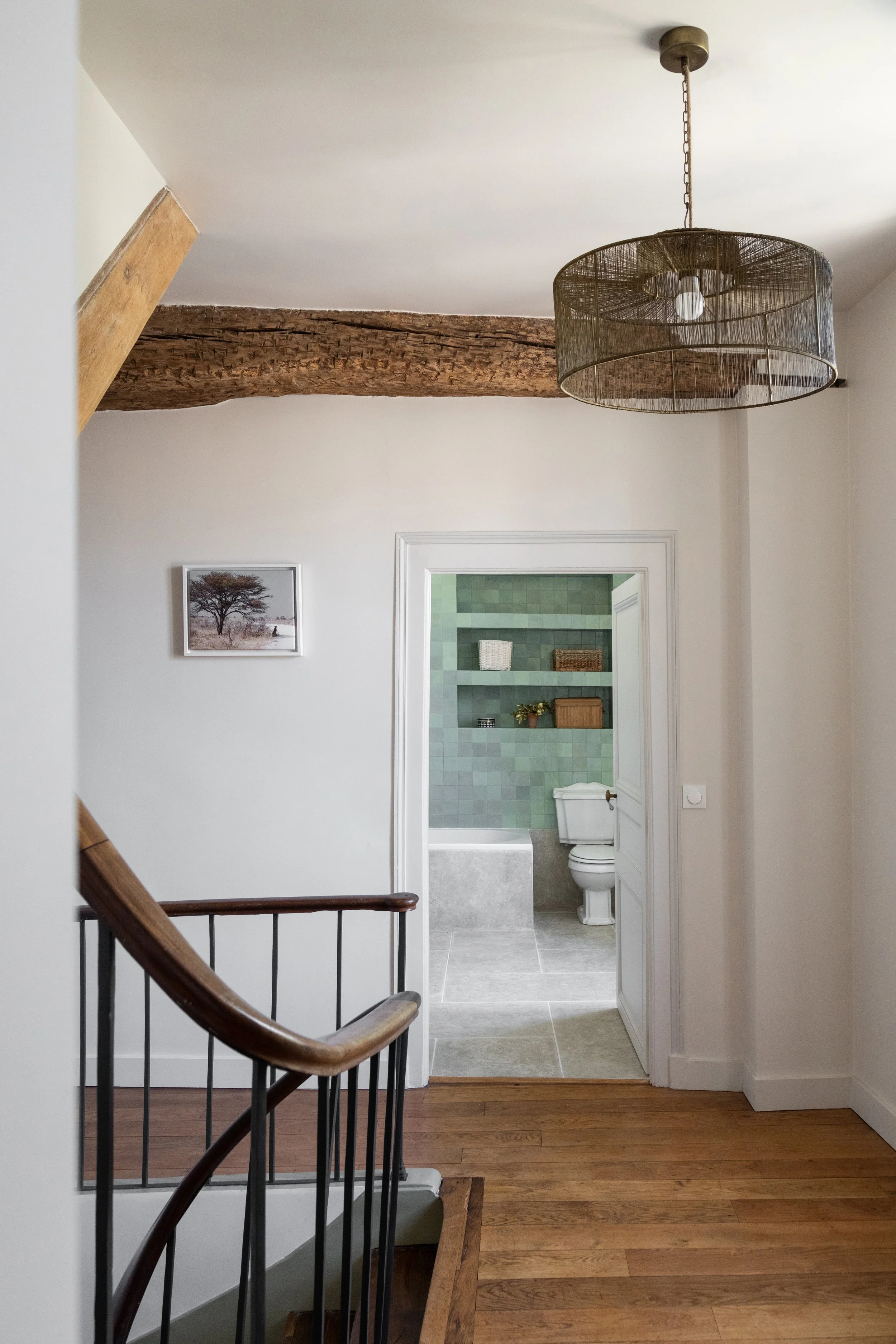 Ce projet a notamment été déterminé par la volonté de conserver un maximum de matériaux d’origine qui contribuaient au charme de la maison lors de son acquisition. Ces derniers, comme par exemple la tomette ou la faïence de la cuisine, ont été restaurés et réutilisés dans les sanitaires du 1er étage.