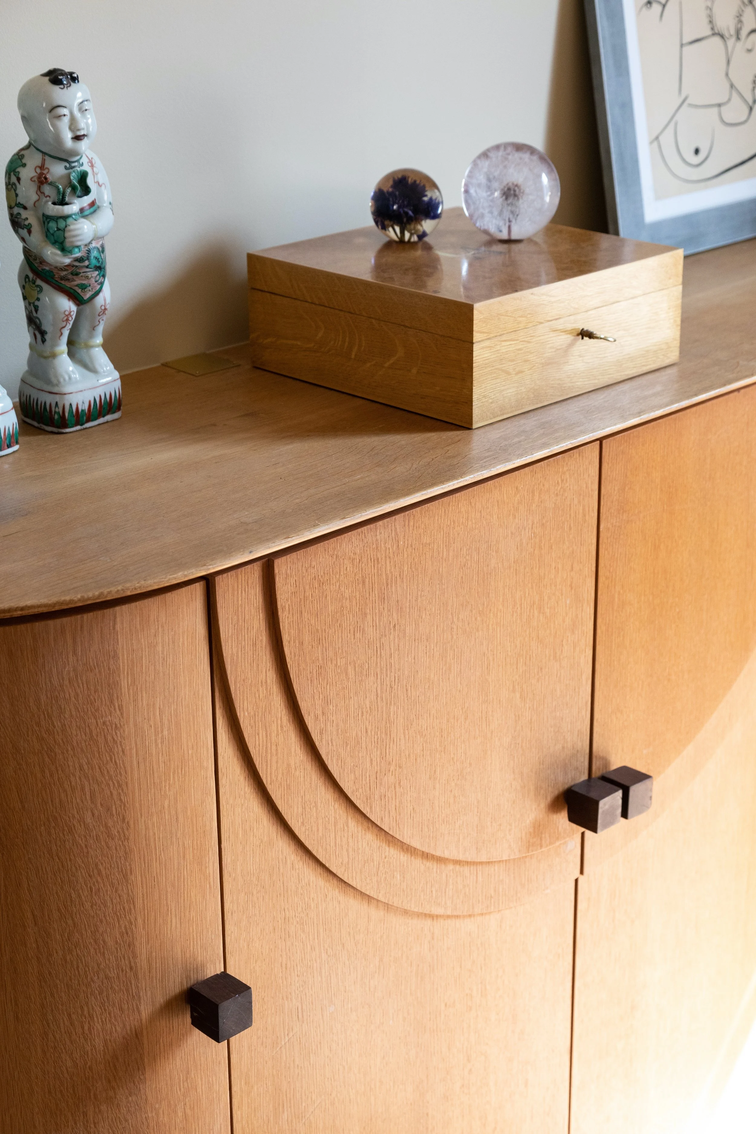 Au rez-de-chaussée, ce dernier se trouve dans l‘entrée qui déssert de part et d’autre les espaces de réception: D’une part un grand salon de 33m2, d’autre part la cuisine qui a été ouverte sur la salle à manger de sorte à fluidifier la circulation et accroître la luminosité dans ce double espace.