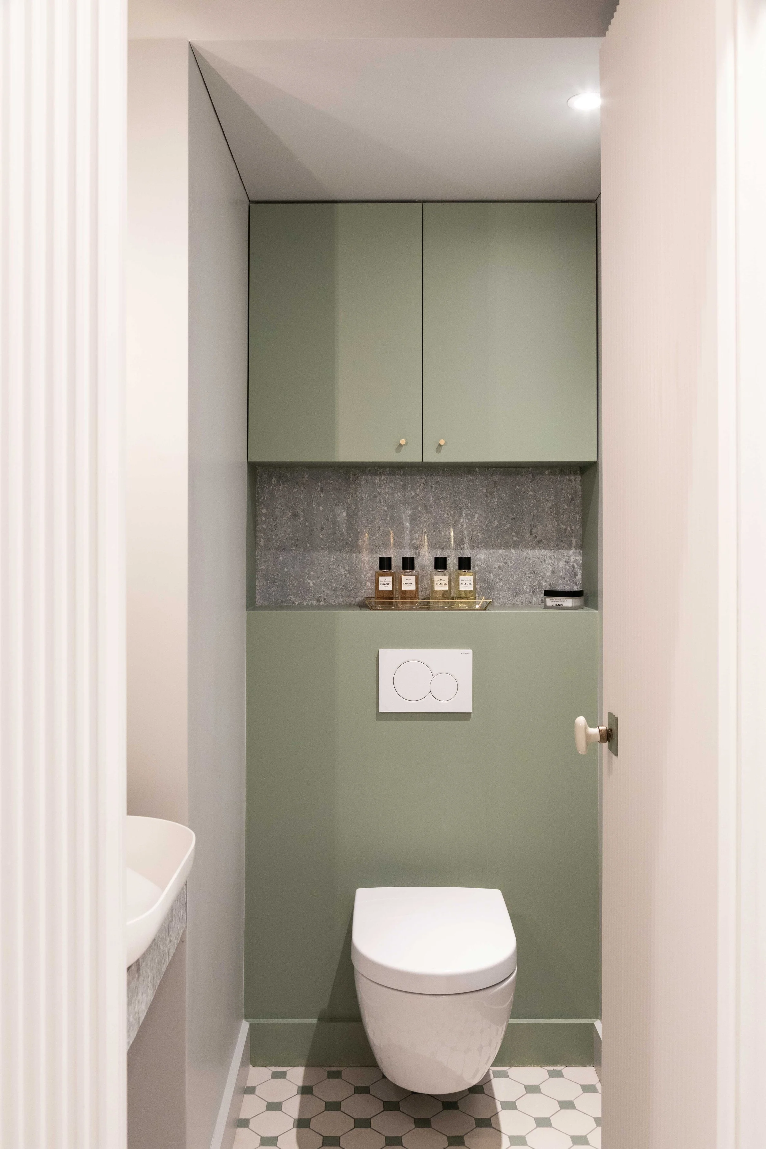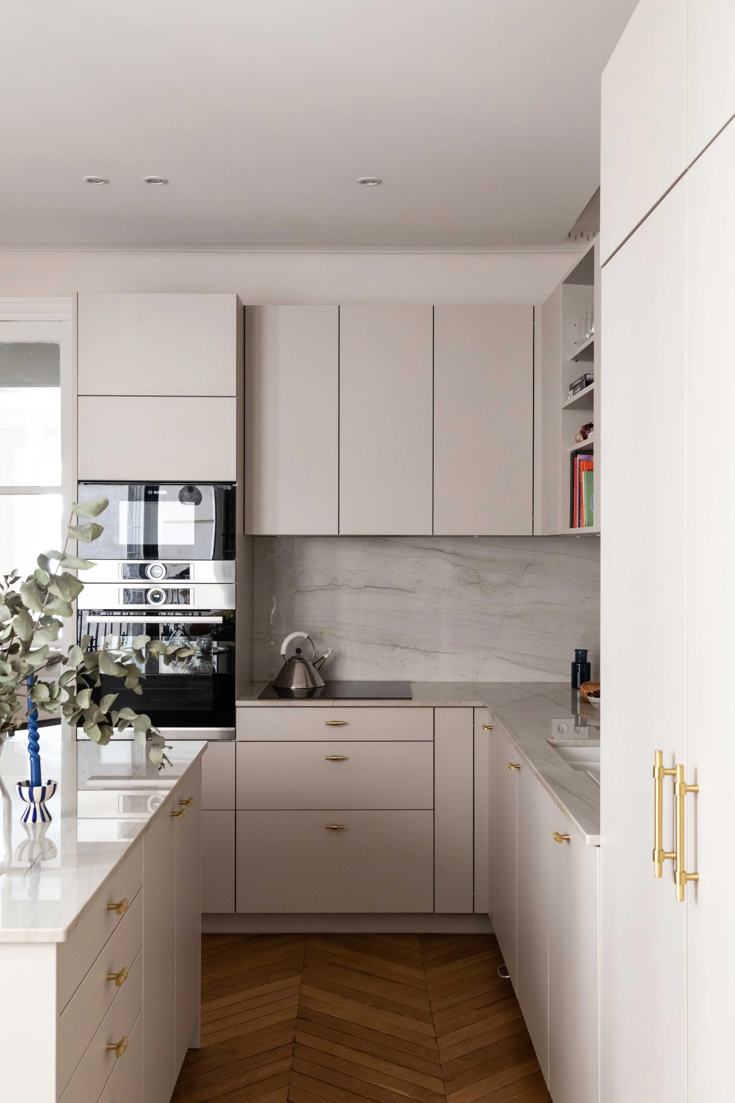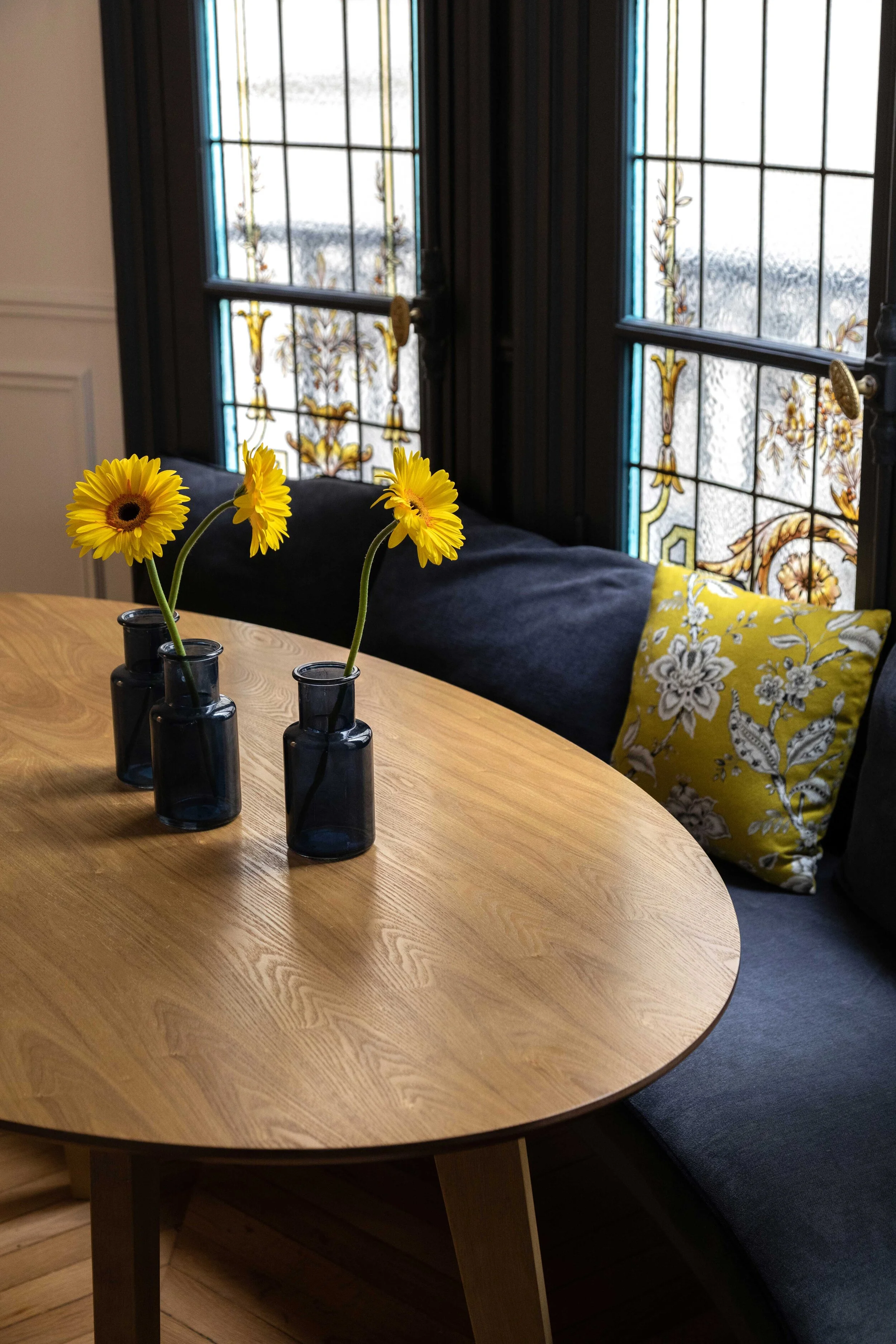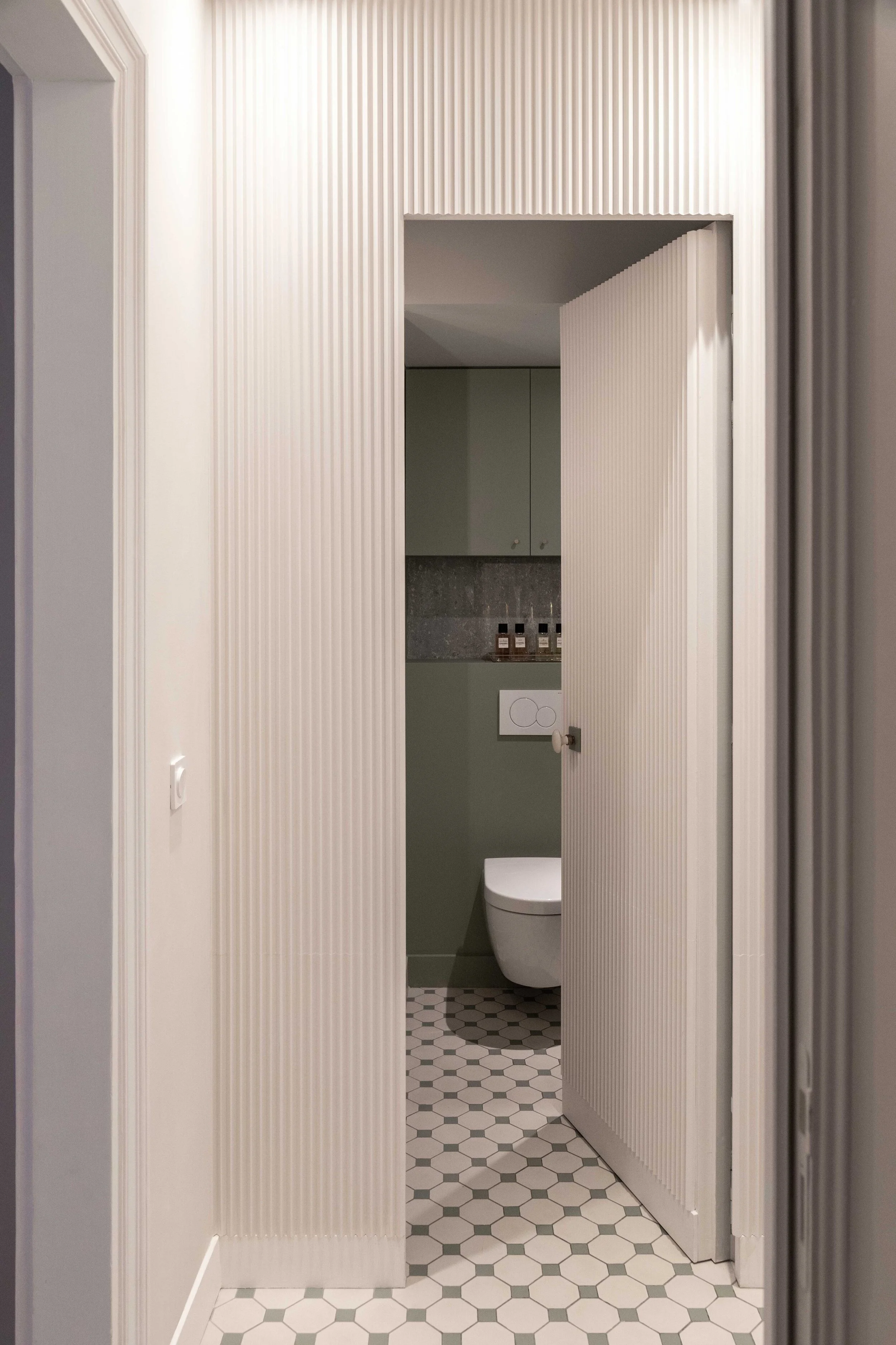 Par ailleurs, les espaces ont été redistribués: La cuisine, devenue chambre à coucher, a été délocalisée dans la salle à manger, et cette dernière a été transformée en cuisine dînatoire avec une banquette sur-mesure installée sous les vitraux.