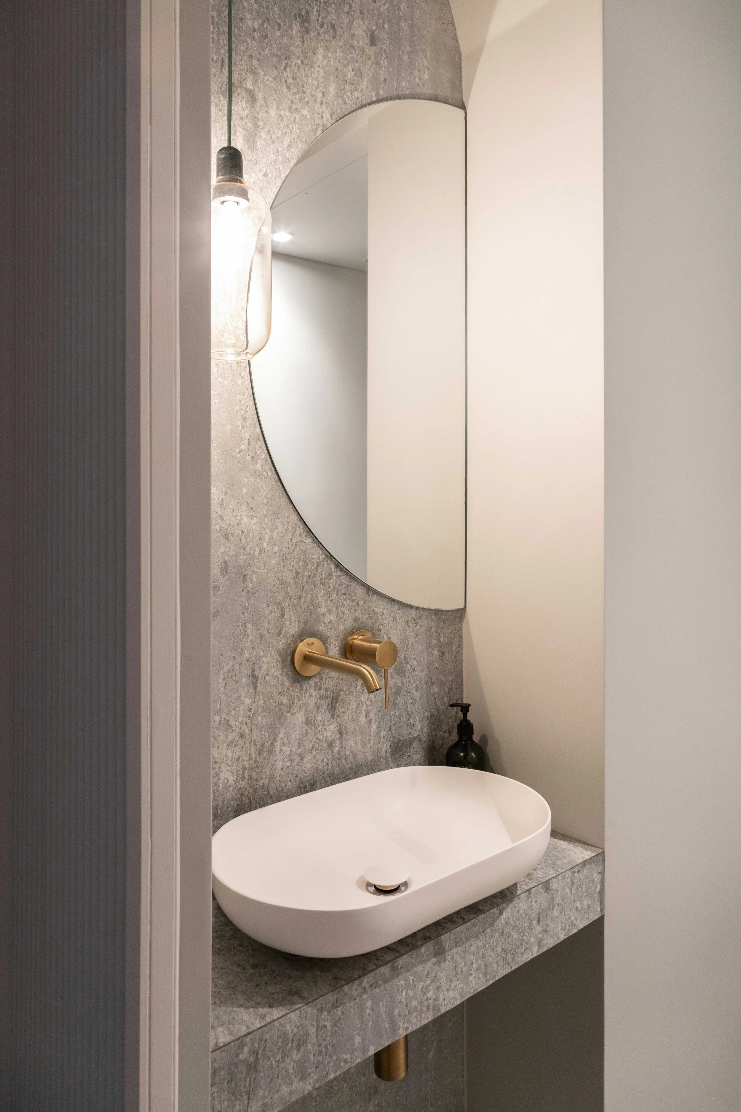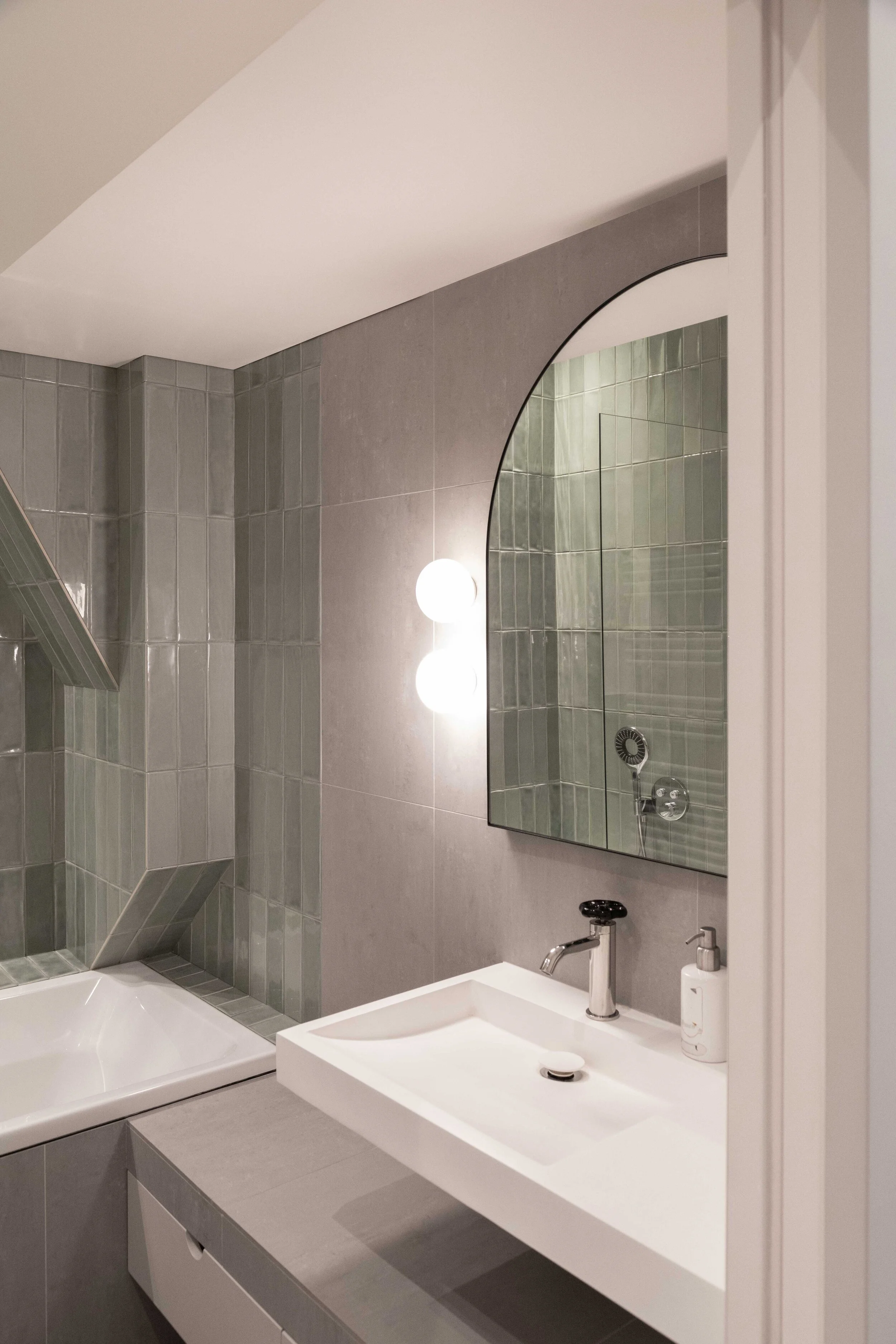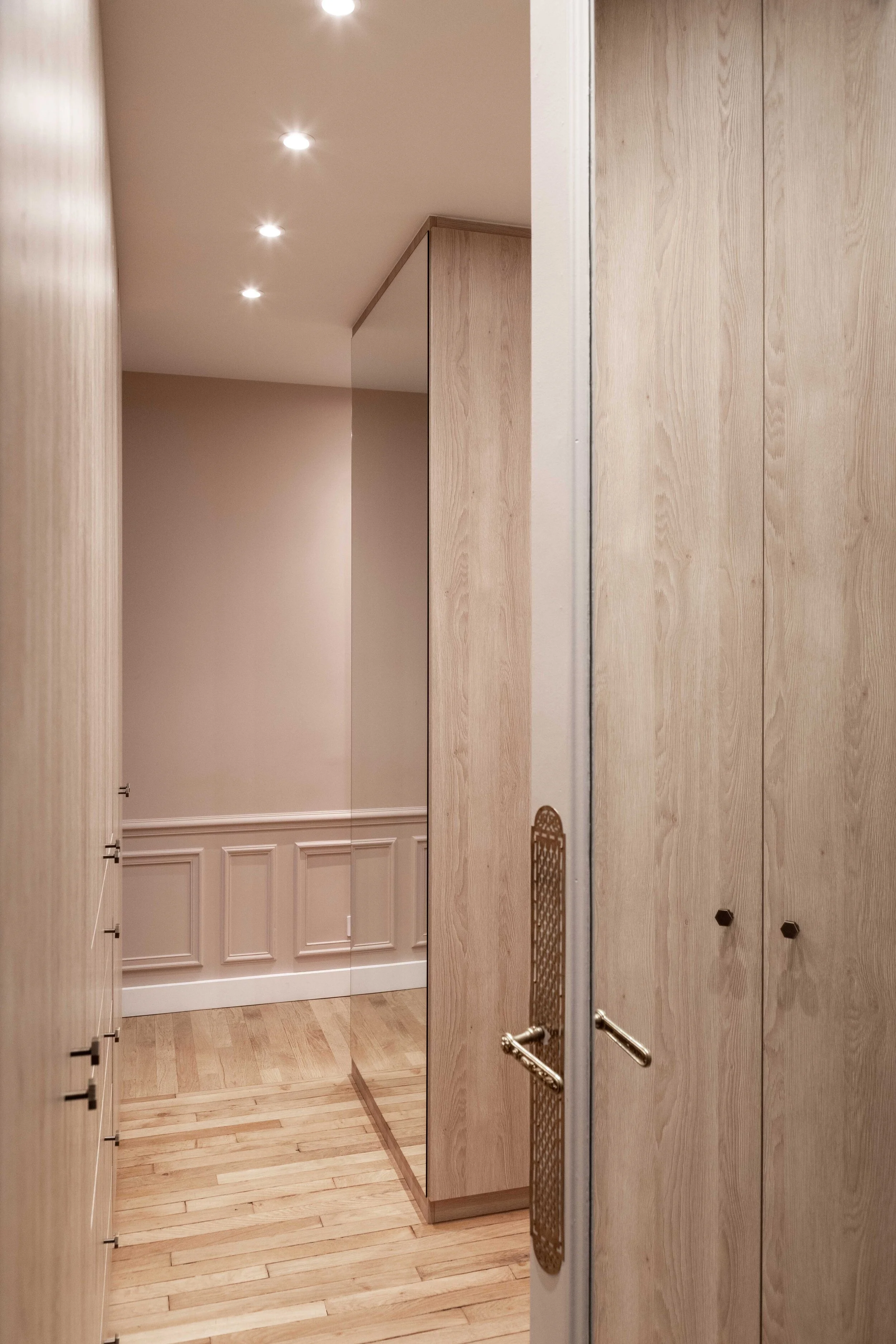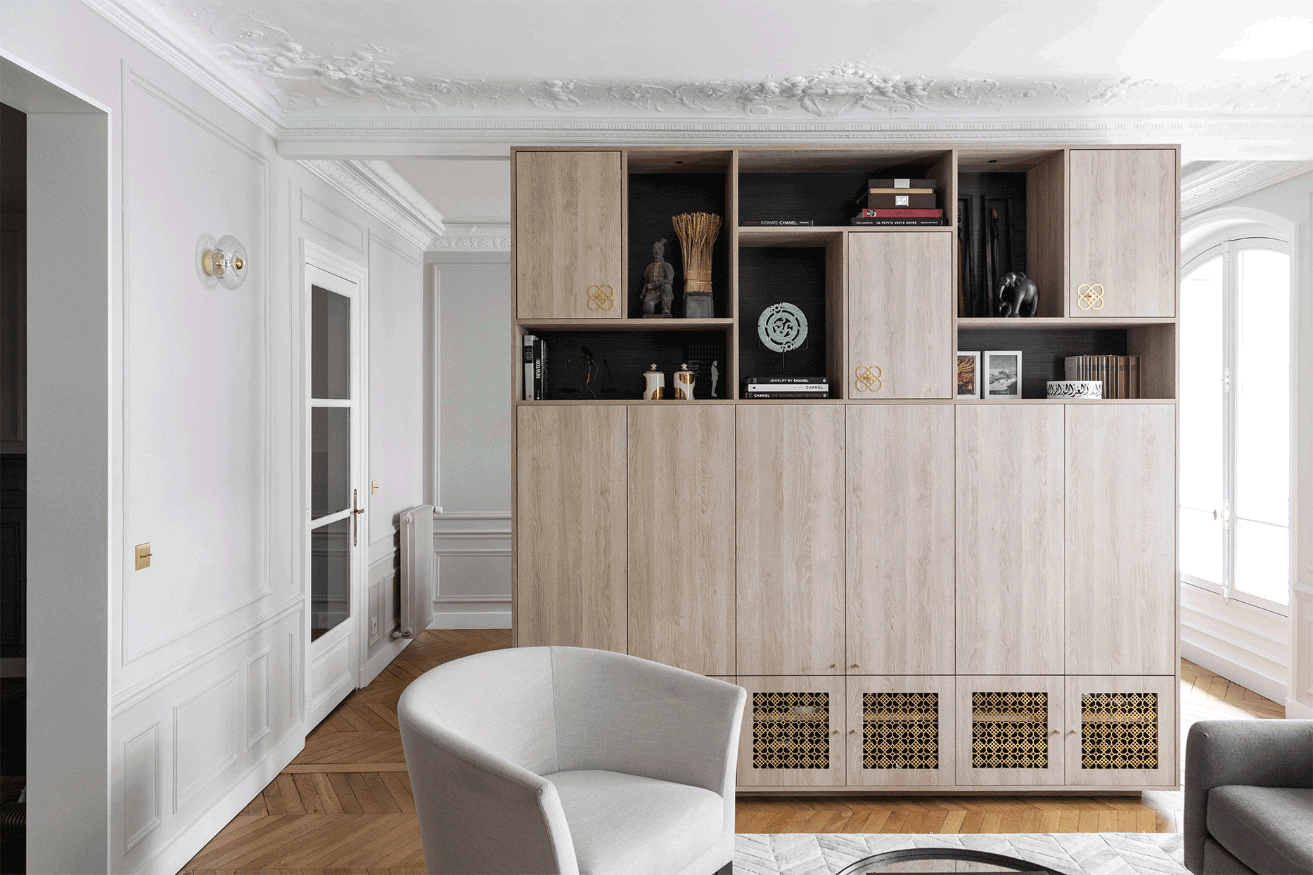 Les moucharabiehs en laiton représentent un motif tiré de la lettre N en arabe, initiale des clients d’origine franco-libanaise, et ont été dessinées pour le projet afin d’apporter une petite touche orientale.