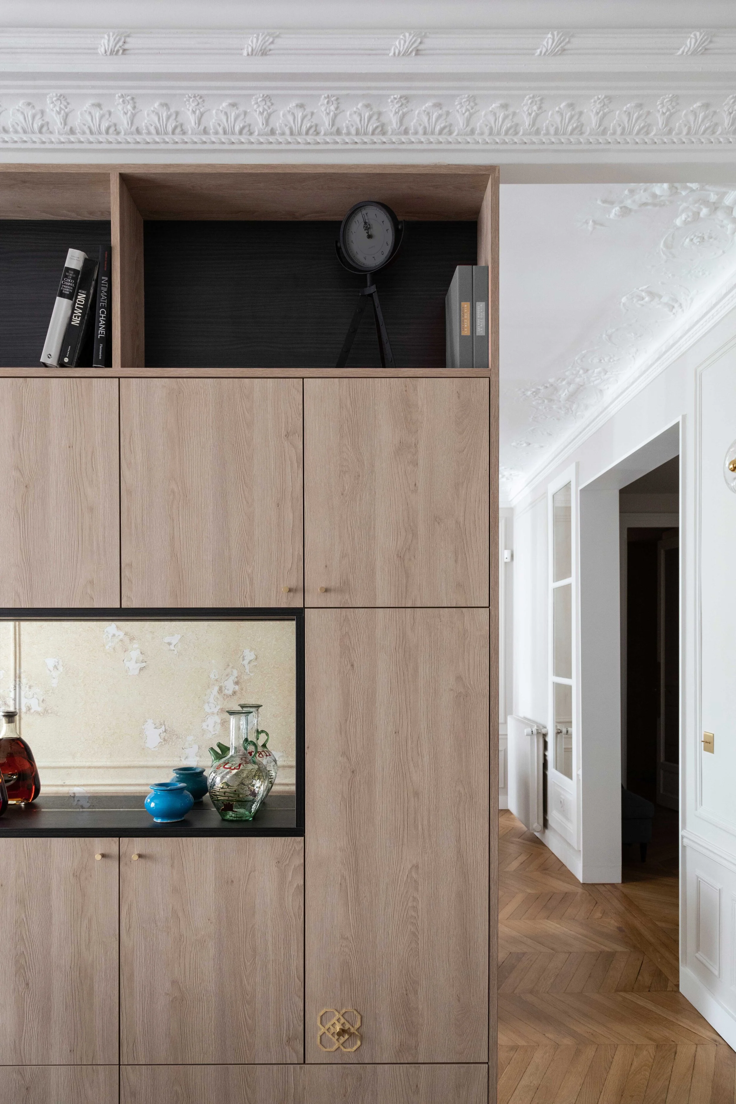 Les murs qui la séparaient du grand salon ont été remplacés par un meuble en bois bi-colore et multi-fonctionnel: Côté salon, il abrite la télévision ainsi que de nombreux rangements, et côté salle à manger, se creuse une niche pour le bar.